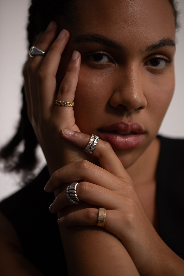 If you like it extravagant, combine several eye-catching rings together. Make sure that you also wear one or two simpler rings: A wide ring studded with zirconia creates an exciting interplay in combination with a narrow, unadorned ring. But it can be even more extravagant: To make your combination even more individual, you can buy rings in different colours. For example, wear rings in gold and rose gold if you prefer subtle contrasts and want to add a playful touch to your outfit. The combination of silver and gold, on the other hand, is a real classic, while silver and rose gold offer a fresh and modern play of colours.